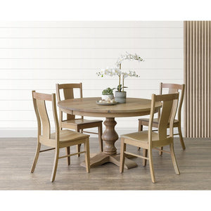 Amish Alana Single Pedestal Round Expandable Dining Table - Shown in Seashell on Rustic Quarter Sawn White Oak. Shown with the Maverick Side Chair.  1-1/4" top. Amish Handcrafted only miles from our store in Lancaster County, PA out of northeastern hardwoods! Limited Lifetime Warranty Available in Oak, Brown Maple, Cherry, Maple, Elm, Hickory, and Quartersawn Oak. Table Height: