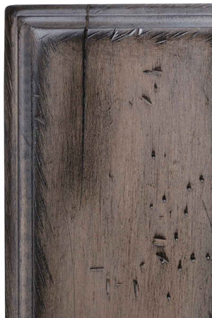 Antiquated Pewter on Brown Maple. Extra nicks and holes, filed edges, simulated cracks, and heavy glazing. Rustic Brown Maple. Unique irregularities such as knots and other small imperfections. Open knots are filled with black epoxy unless otherwise specified. Features Standard Distressing on the back of the Sample. (available in all Brown Maple colors. Not available on all pieces). 3"x 5" sample. It can be returned for full credit.