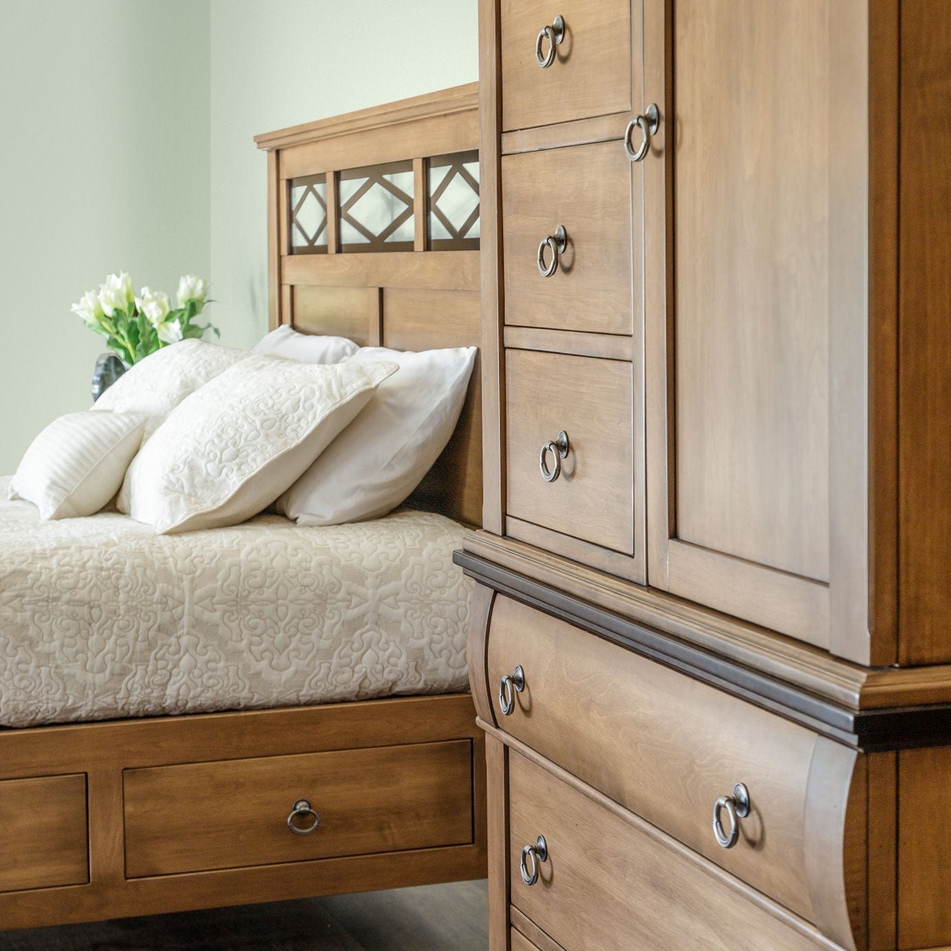 The Amish Avignon Door & Drawer Armoire is made in Lancaster County, PA. Shown in Heritage Wicker & the Top in Heritage Briar. Hardware is the Standard Ring Pull. Handcrafted by Amish craftsman out of solid northeastern hardwoods. Features dovetailed drawers with self-closing slides. Adjustable shelves behind the door