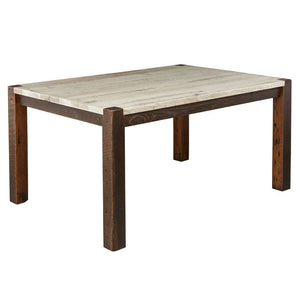 Amish Bedford Reclaimed Barnwood Farm Dining Table - Available in rustic Oak Reclaimed Barn wood Shown in Seat & Tops - White w/Van Dyke Brown Glaze and the rest in Coffee. Shown with Bedford Chair & Bench.Amish Handcrafted in Pennsylvania 30"h x 42"w. Available in 60", 72", 84", or 96" lengthsView StainsMain Color is Base, Accent Color is Top
