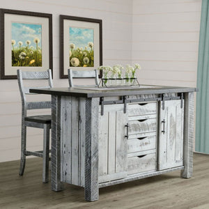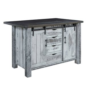 Amish Farmhouse Reclaimed Barnwood Rustic Kitchen Island - Available in rustic Oak Reclaimed Barn wood. Shown in: Tops Black Stain / Rest: White w/ Black glaze. Handcrafted in Pennsylvania. 2 sizes for the top. Rolling barn doors.View StainsMain Color is Base, Accent Color is Top