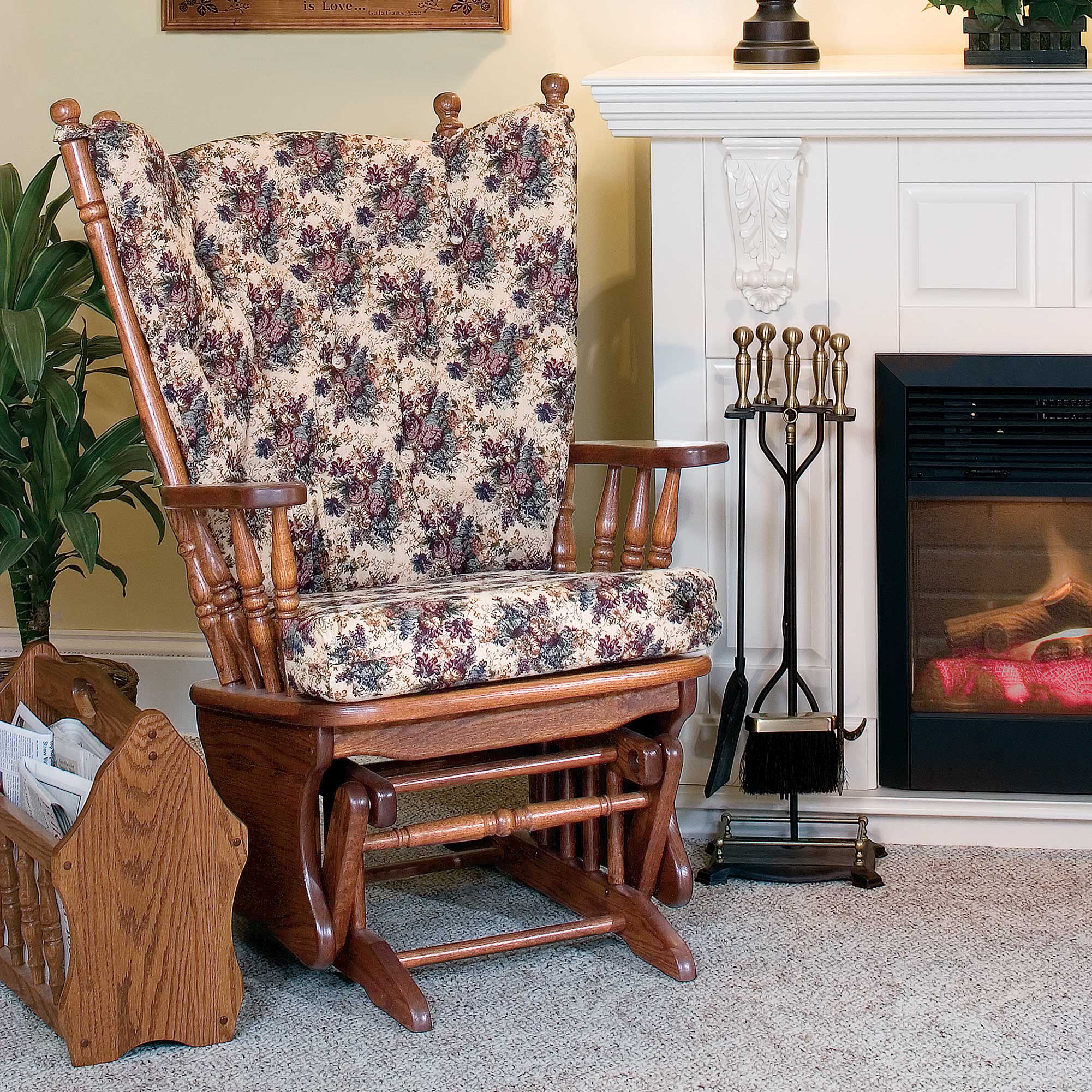 Amish High Wing Back Cushion Glider Rocker - For replacement cushions only click hereAvailable in Oak or Cherry with a large selection of fabrics. Each wing back glider rocker is built to order in southeastern Pennsylvania. This is the same comfortable design we have been selling for over 40 years. Shown in Oak Pecan (1st pic) We also offer this in a swivel style