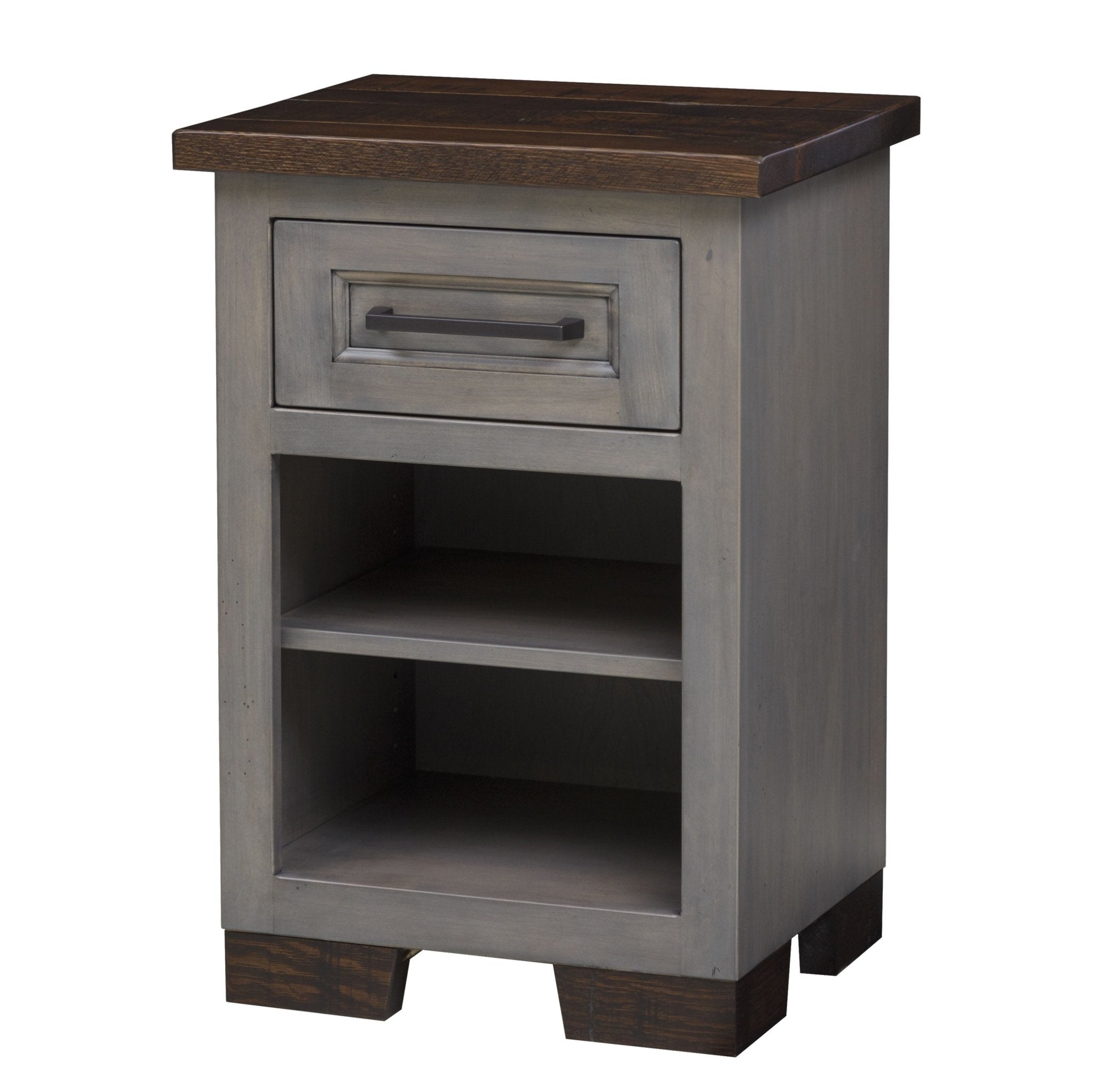 Amish Hudson 1 Drawer Open Shelf Nightstand - Modern lines — industrial proportions. A blend of finesse and strength. Thick contrasting tops and heavy feet and legs speak of qualities only legacies are made of. *Shown in: Top and Feet: Briar Stain on Rustic Quarter Sawn White Oak Rest: 7-SSG Pewter on Brown Maple 20”w x 16"d x 29-1/4"h Amish Handcrafted only miles