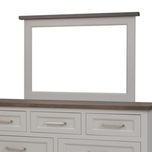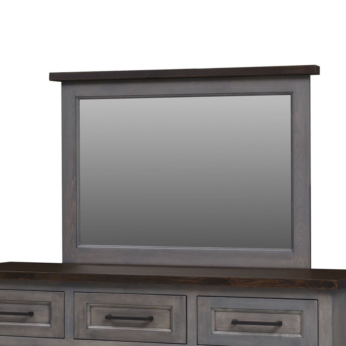 Amish Hudson Mirror (for 44"high dresser) - Modern lines — industrial proportions. A blend of finesse and strength. Thick contrasting tops and heavy feet and legs speak of qualities only legacies are made of. *Shown in: Top - OCS Briar on Rustic Quartersawn White Oak Rest - 7SSG Pewter on Brown Maple 45”w x 31-1/2”h Amish Handcrafted only miles from our store in