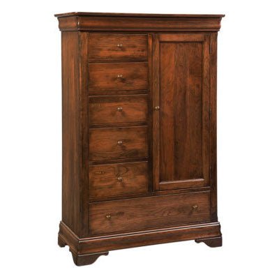 This door & drawer chest features the curved lines of the old world combined with the craftsmanship of the new. Handcrafted by Amish craftsman out of solid northeastern hardwoods. Drawers are dovetailed and feature concealed drawer slides that effortlessly self-close. Adjustable shelves behind the door, plus bonus hidden drawer. Available in 64" h or 71"h.