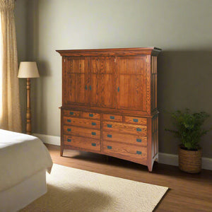 This Mission Mule Chest is part of the Morris Plains Collection. Shown in Oak - Harvest. This is a classic mission style set usually seen in oak or quartersawn white oak. Handcrafted by Amish craftsman out of solid northeastern hardwoods. Drawers are dovetailed and feature concealed drawer slides that effortlessly self-close.