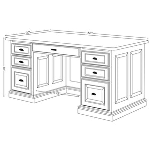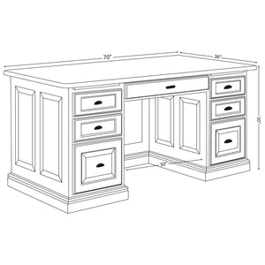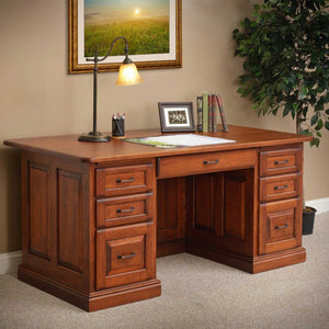 This executive panel desk is perfect for any home office. Shown in Cherry with Standard Distressing Finish and Harvest Stain, but also available in other woods & stains. Order just the desk or add the hutch top as well. Available in Oak, Cherry, Maple. This item can be customized. Available in 2 sizes. 70" x 36"or 65" x 30". This breaks down into 4 pieces for easy moving. Finished back is standard.