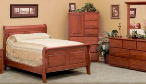 Eden Amish Solid Wood Panel Sleigh Bed - Shown in Queen, Oak - Provincial Stain w/ Standard Footboard (solo image with bed) 1st Room scene ( bed w/low footboard) Brown Maple with MX Stain and      2nd Room scene (bed w/standard footboard) Cherry with Acres StainAvailable in Oak, Maple, Cherry and Quartersawn Oak Your choice of stain or paint color(s) Availabl