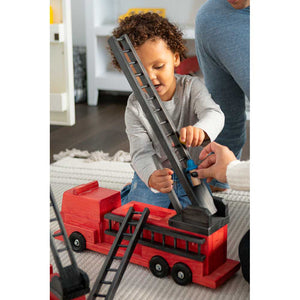 Amish Large Wooden Firetruck Toy - Our Amish wooden firetruck brings real-life features to playtime. Side ladders are removable and the upper ladder swivels with adjustable height to inspire your little ones’ imaginations.