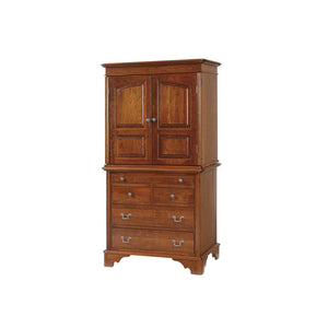 This armoire is part of the Wellington Collection. Shown in Cherry - Woodberry Stain. Wrap around doors. Shelves behind the doors. Handcrafted by Amish craftsman out of solid northeastern hardwoods. Drawers are dovetailed and feature concealed drawer slides that effortlessly self-close.