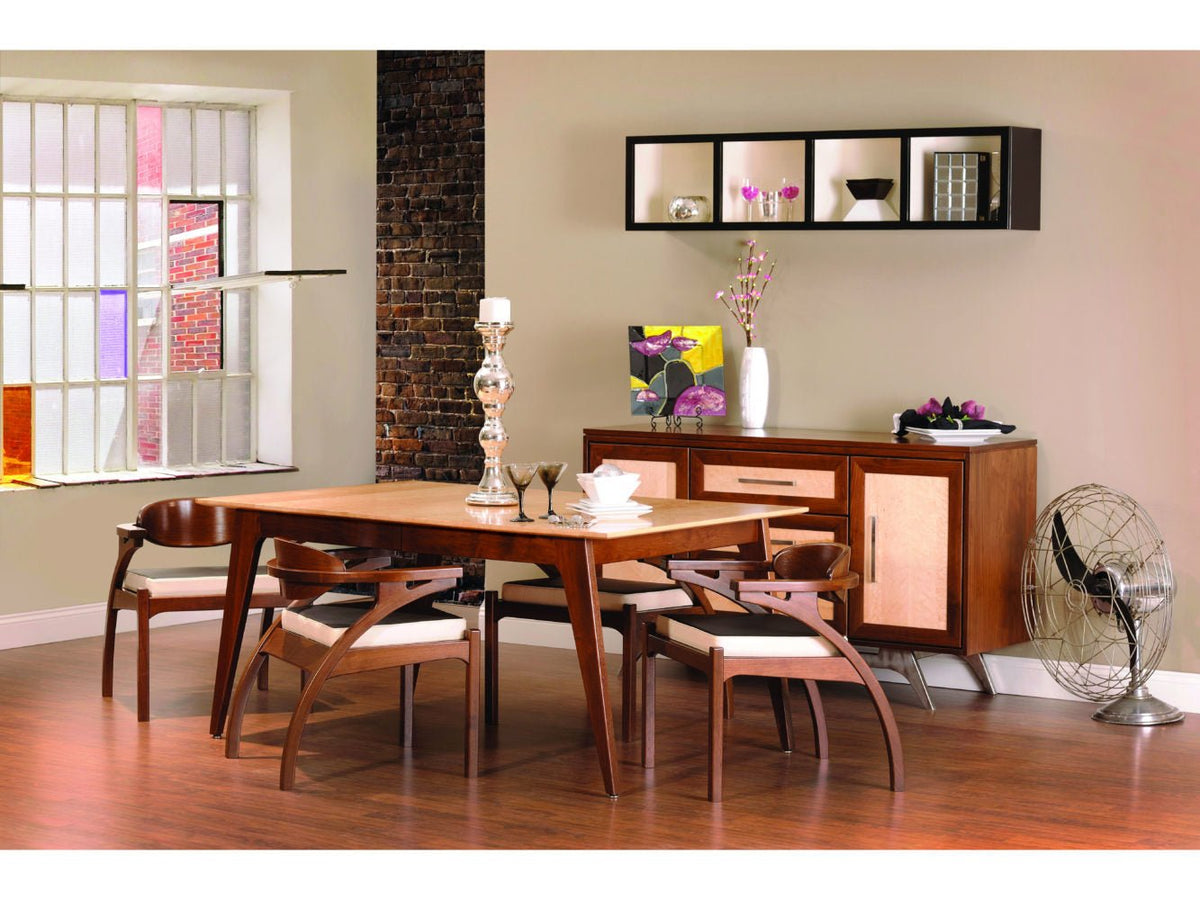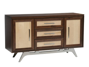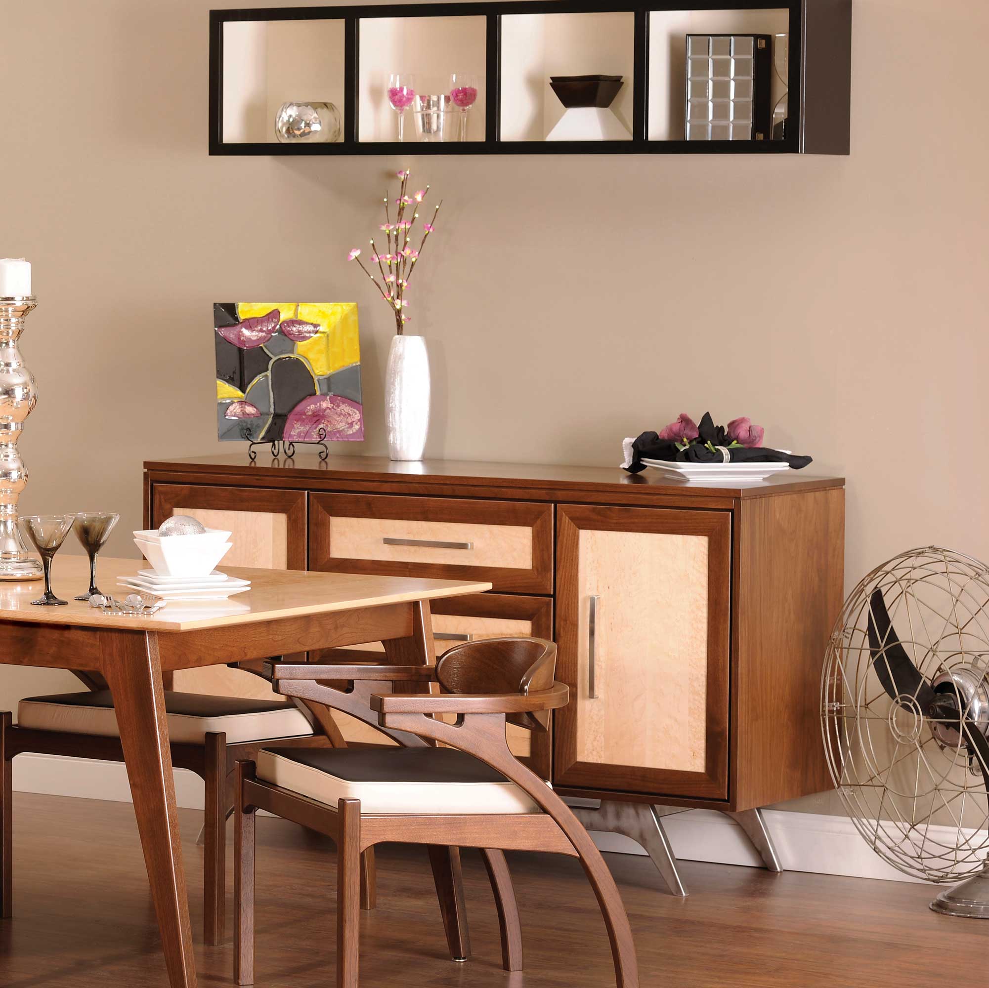 Amish Woolworth Mid Century Modern Dining Storage Sideboard - This Woolworth sideboard has 2 doors and 3 drawers. Shown in Walnut with optional Exotic Maple Birdseye Maple (panels) / Antique Oak finish (Level 1). Hardware: B132. Available in Oak, Maple, or Cherry. Handcrafted by Amish craftsman out of solid northeastern hardwoods. There is no size customization on this product.Vi