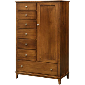 This door and drawer chest features cleans lines and self-closing drawers. Shelves behind to door. Shown in Upland - Heritage on Maple. Hand crafted by Amish craftsman out of solid northeastern hardwoods.
