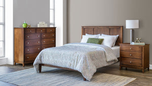 This Modern Shaker style bedroom set features cleans lines. Hand crafted by Amish craftsman out of solid northeastern hardwoods. The bedroom is shown in Heritage Upland. This package includes the Panel Bed with low footboard, bedside chest, and lady's dresser.