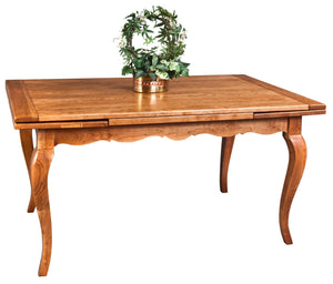 This country style draw leaf table comes in 4 sizes and features hidden draw leaves on each end that 1 person can easily utilize to make the table larger and add seating for up to 4 additional people. Shown with the Farmhouse Chair.