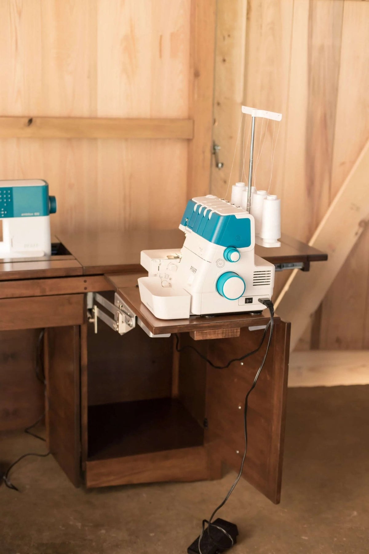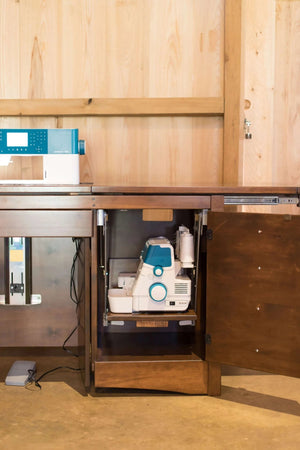 66''l x 31.5''h x 21.5''d, three drawers, serger lift, spool storage