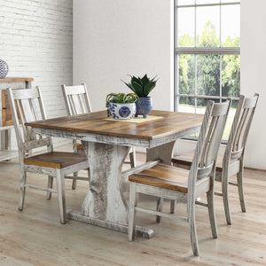 Amish Tremont Rustic Trestle Dining Table Set - Available in rustic Oak Reclaimed Barn wood. Set includes1 - 42"x 72" Heartland Leg Table with 2 - 12' Leaves6 - Wright Side Chairs (2 more then pictured *Buffet sold separatelyShown in: Top - Natural w/ Van Dyke Brown glaze / Rest - White Paint w/ Van Dyke Brown glazeHandcrafted in Pennsylvania View StainsMain Color i