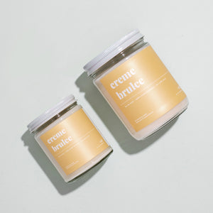 Creme Brulee Soy Candle - Petite - Our newest Creme Brulee candle is actually a remake of our super fun April Fools Day candle, Spoiled Milk, which was such a hit that we wanted to bring it to you year round! This scent smells just like a deliciously creamy Crème Brûlée dessert with rich notes of custard, rum, vanilla and maple! FRAGRANT NOTES:top - sug