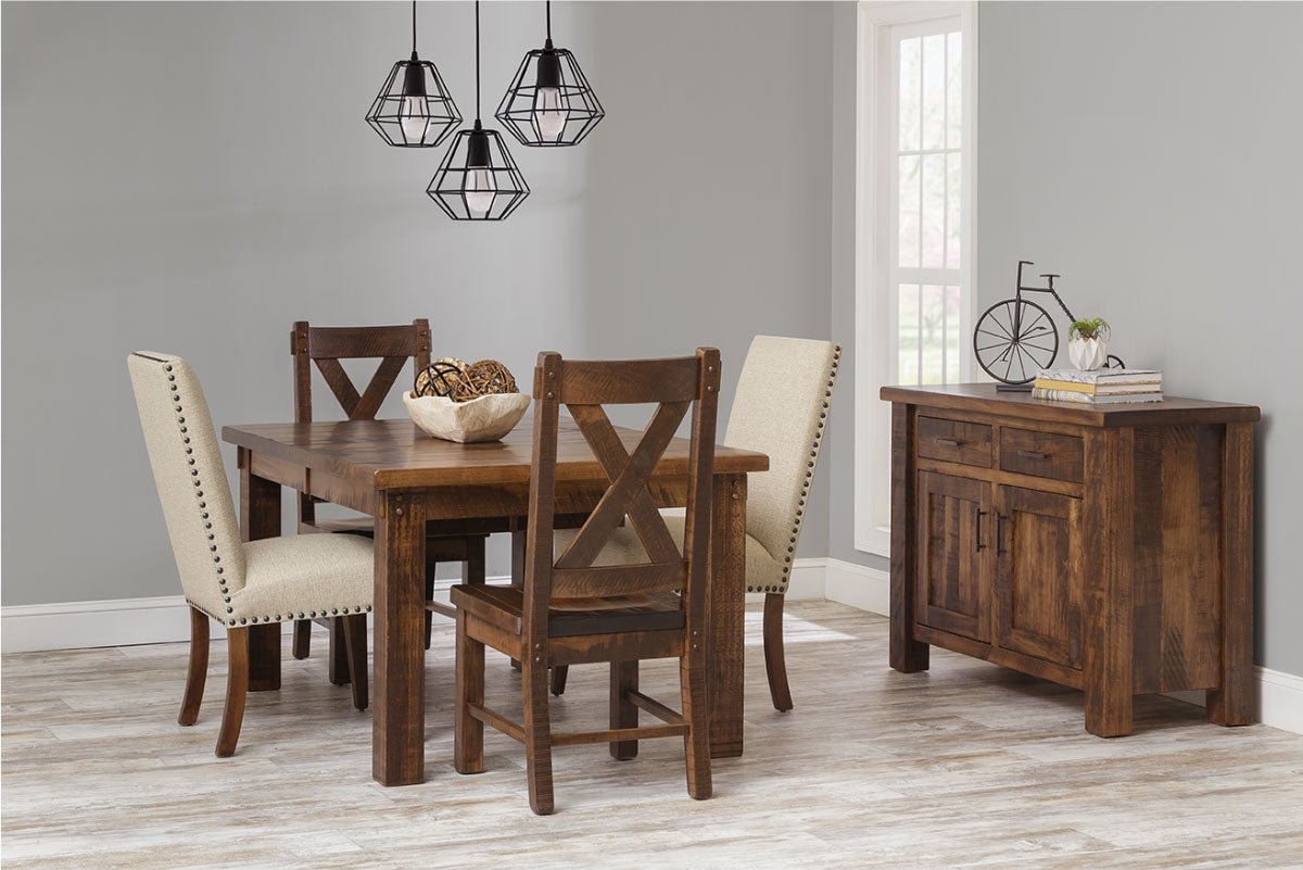 The Houston Leg Table in Shown in Rough Sawn Wormy Maple / Aged Special Walnut! Shown with the Houston 2-door buffet and the Denver Chair. Amish Handcrafted only miles from our store in Lancaster County, PA out of northeastern hardwoods! Roughsawn has saw marks and a slightly uneven 'plank' look on the top.  Limited Lifetime Warranty Available in Oak, Brown Maple, Cherry, Maple, Elm, Hickory, and Quartersawn Oak.