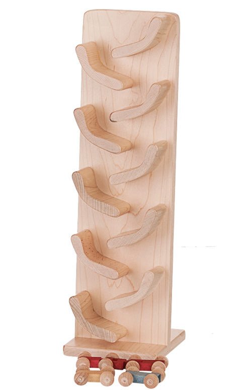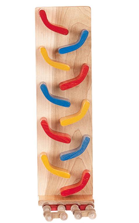 Children of all ages will delight in racing our wooden train cars down the vertical track. Load the wooden train roller cars at the top and watch them jump from side to side as they wobble to the bottom.