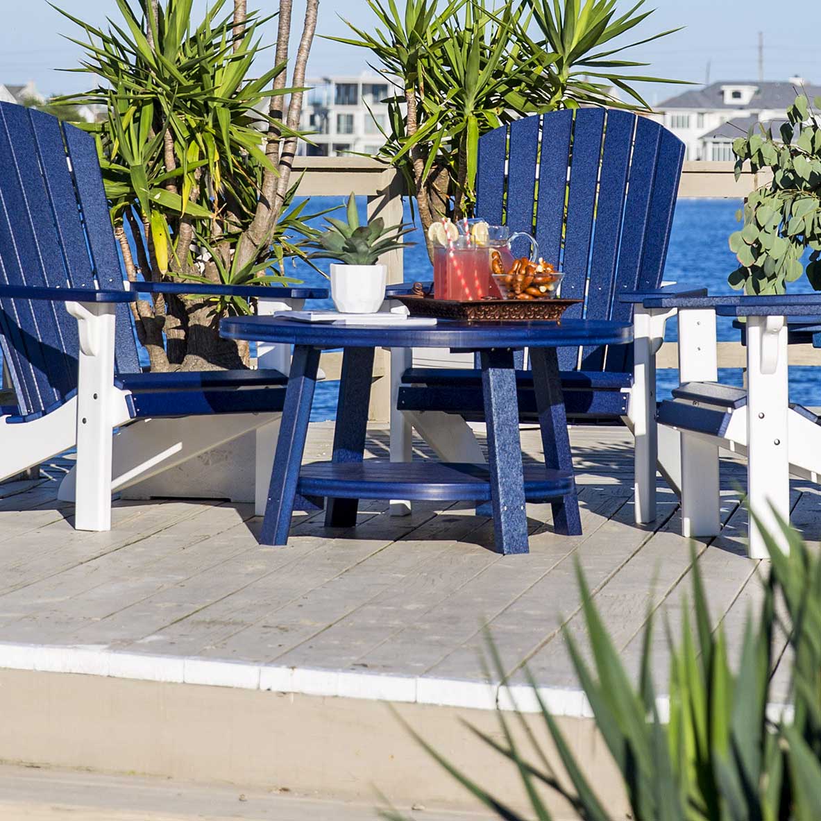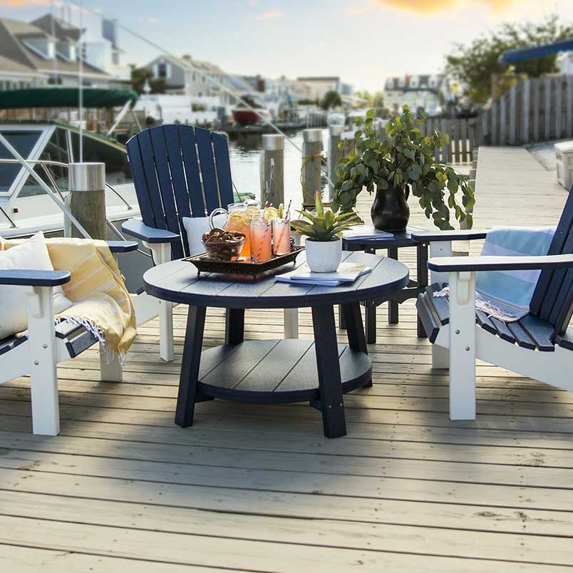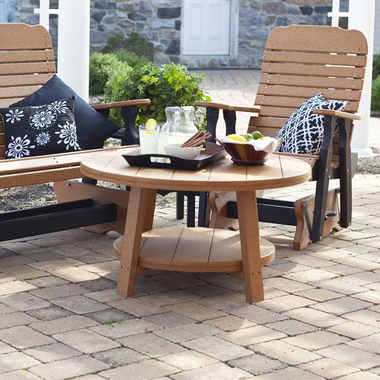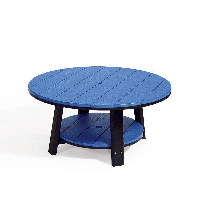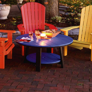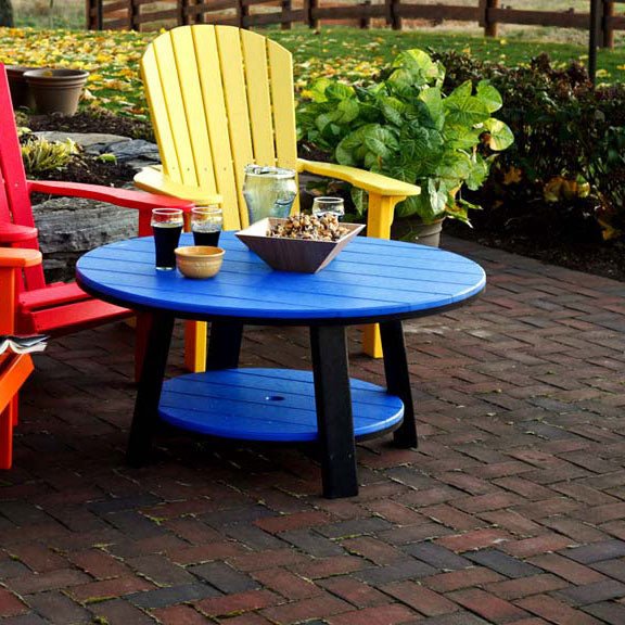 Amish Outdoor Patio Conversation Round Coffee Table - Handcrafted a few miles from our store in Lancaster County by an Amish Craftsman. This Amish Outdoor Patio Conversation Round Coffee Table is Available in solid color or two color combination (Main Color is top & shelf. Trim is legs).Earth Friendly - Fully RecyclableStainless Steel Bolts & ScrewsNo splinters, s