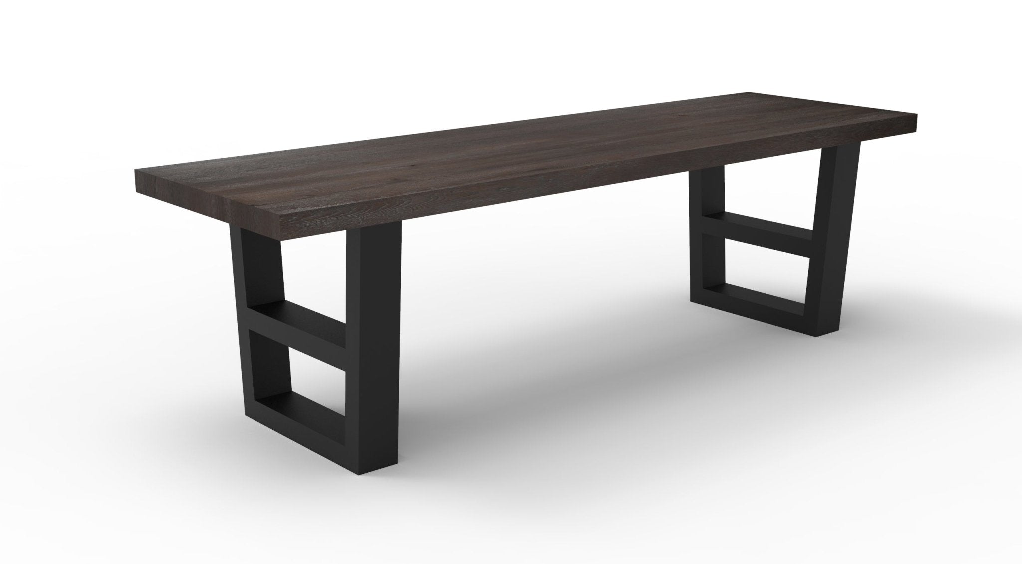 Wallace 60" Oak Dining Bench - Sandblasted Black - Arriving March, 2024.  Exclusive Carolina Live Edge product. Manufactured from solid oak. Steel base, designed to hold the weight of the 1.6" oak top. Dimensions: 60" long x 18" wide x 18" high